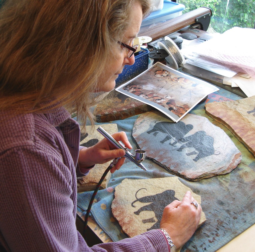 Cave artists used cave water and mineral pigments for paintings. Iron oxide can be a variety of colors from yellow, red and green to black. Umber can be brown, red or black. Black manganese is, as you might guess, black. I use airbrush paint on my stones in the pigment minerals that were available to paleolithic artists. Airbrush paint is fine-grain pigment that gets absorbed into the stone without plastic residue like acrylic paint, but can be layered.
